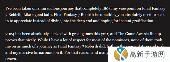 作者总结,虽然对大多数提名游戏都充满敬意,但没有哪一款游戏像《重生》一样,给其带来了如此深刻的旅程,基于这些理由,《重生》完全配得上年度最佳游戏的荣誉。