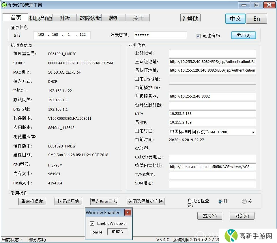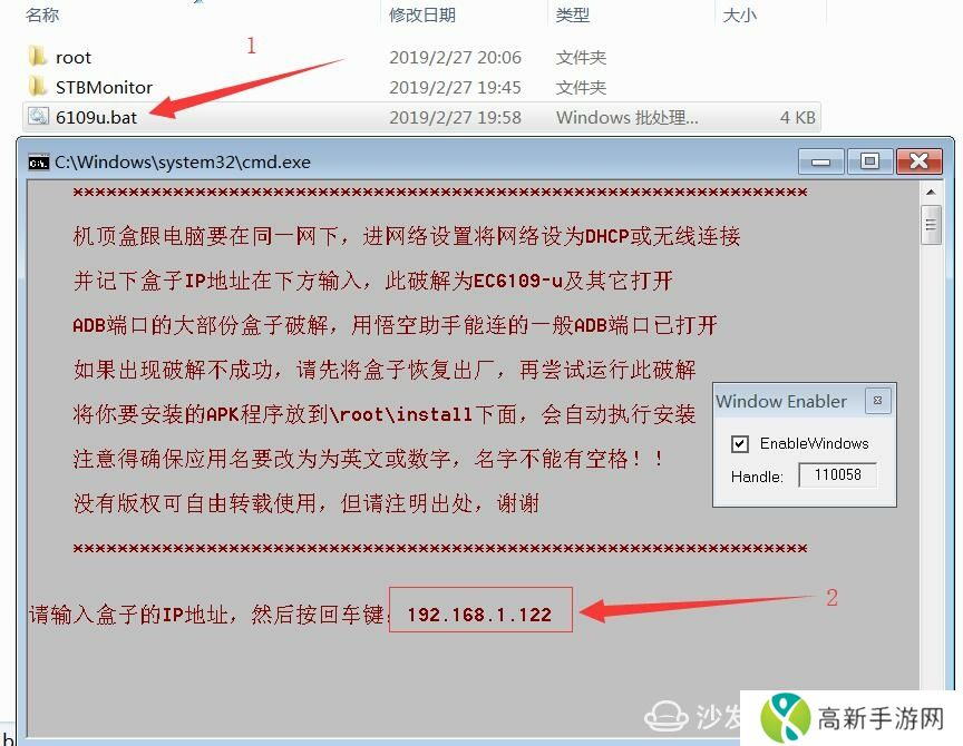 河南联通测试通过,在6108包的基础上修改的,注意:提示命令非法的是STB版本不对,请试着使用STB4.03或升级下机顶盒,适用型号:EC6108V9_V9U_V9E_V9A_V8,EC6109U,暂不适用EC6110M、T破解条件:盒子网线连接,另外一端接路由器,路由器和电脑在同一个局域网内;切勿将盒子连接光猫文件链接::https://pan.baidu.com/s/1cqhx0LjbXoajSi7OC8N6nQ 提取码:s0uo备选链接1:https://share.weiyun.com/Z9loIqtM 密码:zgt8hf备选链接2:https://115.com/s/sw3vb3u3z1i# 访问码:h6c11、打开文件夹中:enabler.exe