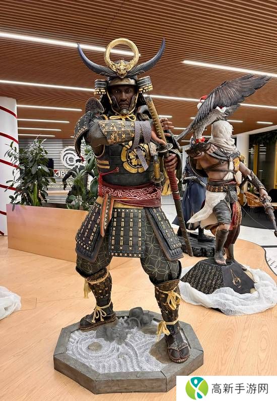 旁边还摆放着《刺客信条:起源》巴耶克和《刺客信条:大革命》亚诺的雕像,远处还有明显的Ubisoft Logo,应该是在育碧大楼内部拍摄的。