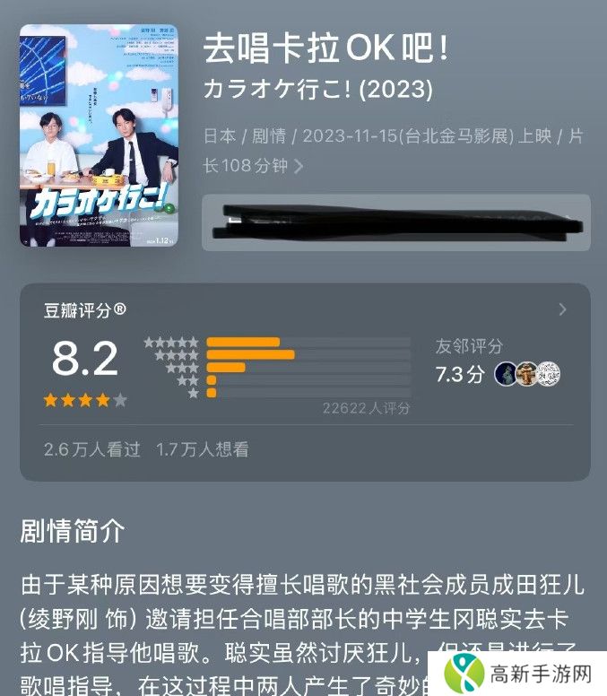 该片海外上映后观众反响热烈,豆瓣评分高达8.2分,并在“一周口碑电影榜”上连续霸榜4周。实力派演员绫野刚和新人斋藤润主演,通过轻松幽默的方式探讨了友情、成长和自我接纳等主题。两个看似不可能有交集的人,因为卡拉OK而结缘。
