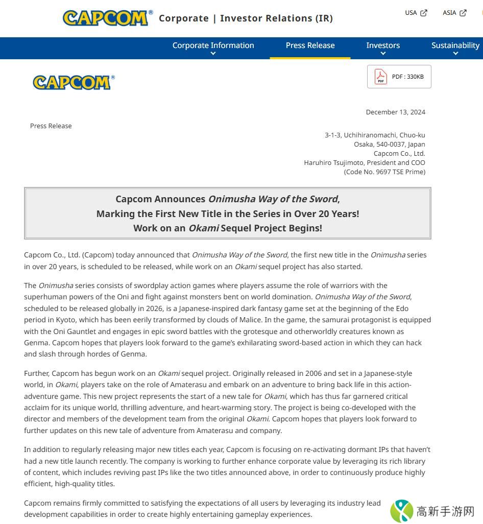 此外卡普空还强调:“该公司正致力于利用其丰富的内容库来进一步提升企业价值,其中包括复活《大神》和《鬼武者》等过去的IP,以便不断推出高效、高质量的作品。”