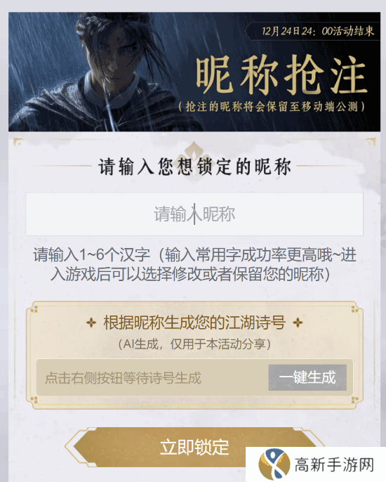 在本活动中,玩家可以提前锁定游戏账号的昵称,抢注的昵称将会保留至移动端公测。玩家还可以根据输入的昵称生成专属江湖诗号!