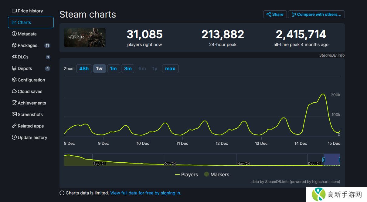 《黑神话:悟空》更新后 Steam近期峰值重回20万
