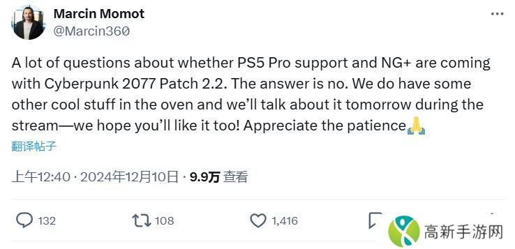 CD Projekt RED重新点燃了社区对《赛博朋克2077》的热情,宣布了将举行关于新更新2.2的REDstream节目。考虑到团队在更新2.1后转向其他项目,人们期待这次更新能够提供一些期待已久的功能。不过全球社区总监Marin Momot对两个功能泼了冷水——新游戏+模式和PS5 Pro专门支持。