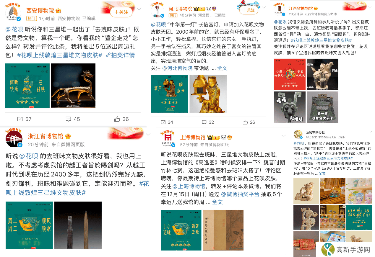 文博机构对花呗这一举措的热情回应也充分展示了年轻人对传统文化的热爱和追捧。在#花呗上线敦煌三星堆文物皮肤#登上微博热搜后,多家博物馆纷纷向花呗推荐自家的珍贵文物,希望它们也能有机会登上花呗的皮肤。圆明园遗址公园的马首铜像、浙江省博物馆的越王者旨於睗剑、上海博物馆的高逸图、西安博物馆的鎏金走龙、南越王博物馆的圆雕长袖玉舞人像等,都成为了网友们热议的焦点。