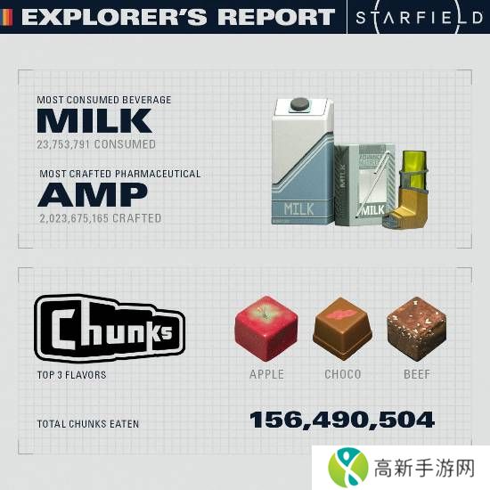 吃喝方面:牛奶是玩家喝得最多的饮品,总计消耗了2375万袋。AMP是最受欢迎的医药品,使用量已达20多亿个。