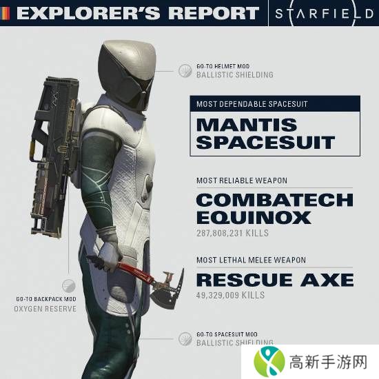 装备方面:曼提斯宇航服是玩家最喜爱的装备,最受欢迎的武器是Combatech Equinox,玩家已击败超过2.87亿个敌人。RESCUE斧子是最常用的近战武器,累计击杀4900多万敌人。