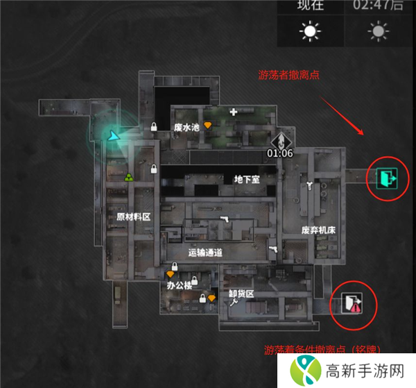 选择游荡者开局与一般对局不同,游荡者有专属的撤离点,同样也分为撤离点和条件撤离点,比如在巴夫工厂这张地图,萤火虫的撤离点在左侧,而游荡者的撤离点在地图的右侧,如果大家想玩游荡者的话,要注意这点(不同时段撤离点位置会有变化,本局游荡者撤离点如图示)。