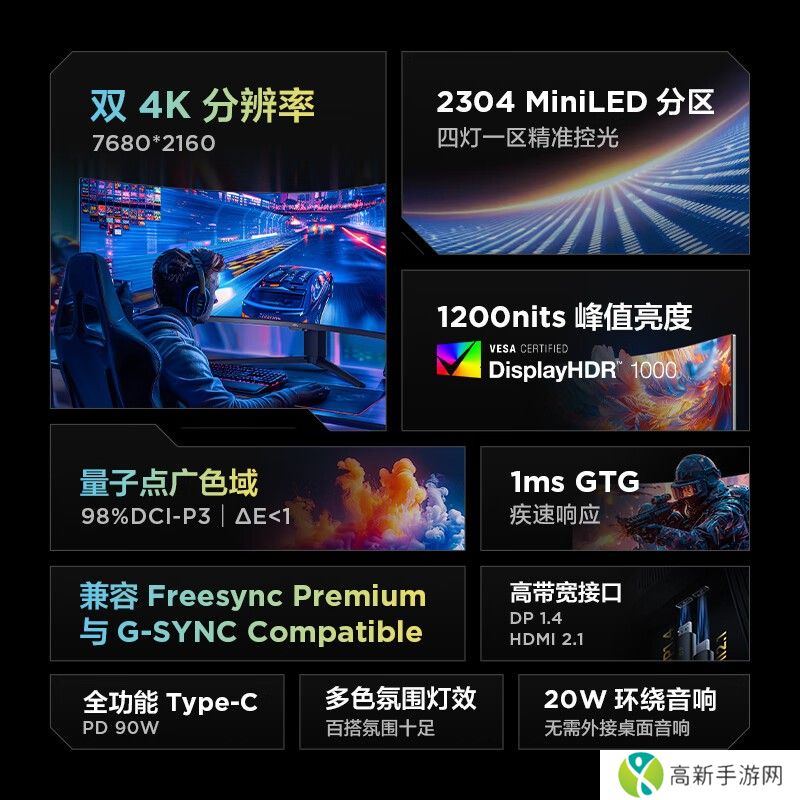 57U9搭载了57英寸的曲面HVA屏幕,曲率为1000R,支持mini LED背光技术,带有2304个背光分区,色深为10bit(8bit+FRC),显示比例为32:9,分辨率为双4K(7680 x 2160),刷新率为120Hz,响应时间(GtG)为1ms,峰值亮度为1200尼特,静态对比度为3000:1,DCI-P3色域为98%,得到了VESA DisplayHDR 1000认证,兼容NVIDIA G-SYNC Compatible和AMD FreeSync Premium技术。此外,背面还带有多彩氛围灯设计。