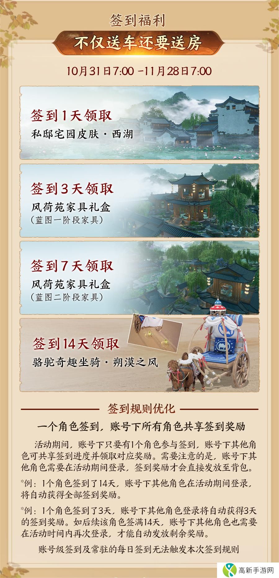 签到首日即可领取杭州西湖景区同款私邸宅园皮肤,价值120万园宅币的同主题配套绿柳清荷家具礼盒参与活动免费可得,拎包直接入住!除此以外,踏入风沙扑面的西域大世界,不如再带上“新车”吧!骆驼奇趣坐骑“朔漠之风”将踏着专属仙人掌脚印,优哉游哉,不紧不慢,陪你从容游瀚漠,驰骋西域大世界!
