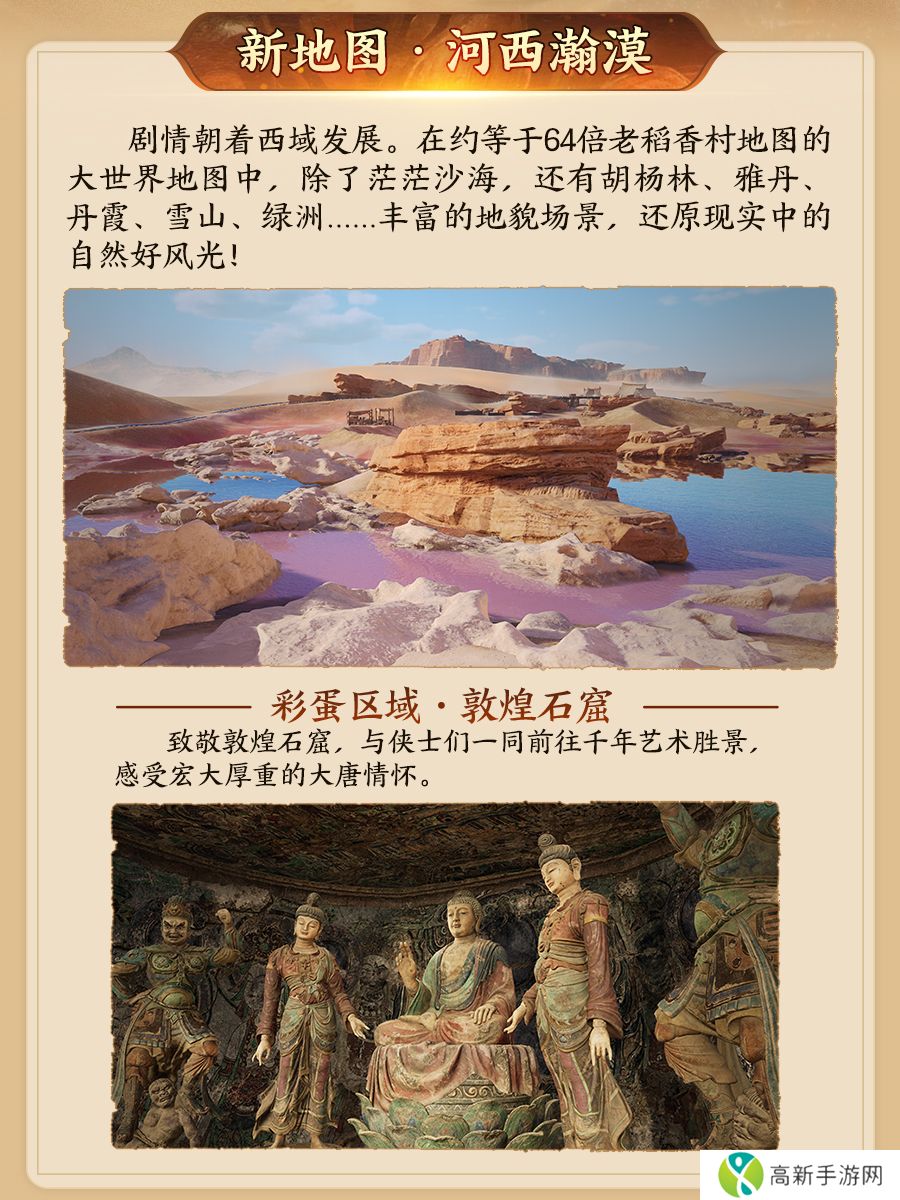 携手有爱玩家及中国敦煌石窟保护研究基金会,《剑网3》为莫高窟保护性展示工程贡献了一份来自大唐侠士的力量。而在游戏内,我们也在全新西域大世界场景“河西瀚漠”中致敬敦煌石窟,为侠士们展现这背后多彩而灵动的艺术魅力与文化内涵。这里是横贯欧亚大陆的古老商道,是古代东西方贸易的桥梁,让我们一同于方寸屏幕间纵览万里风烟,塞外风韵!