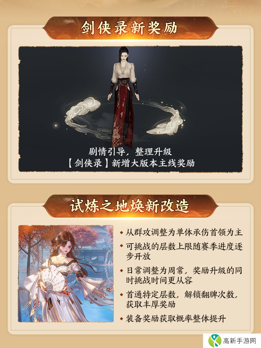 千帆过,江湖故事再添墨。为了让侠士更加清晰地探知背景故事,【剑侠录】以全新面貌与侠士再会,大版本主线奖励全面升级,精美武技殊影图和专属称号逐一登场,免费获取全民可得!试炼之地焕新改造后,保留高层关卡获取无封装备的难度(即现行PVE玩法最高难度追求)的同时,让其余各个阶段的关卡都有对应的奖励,欢迎更多侠士尝试和参与!