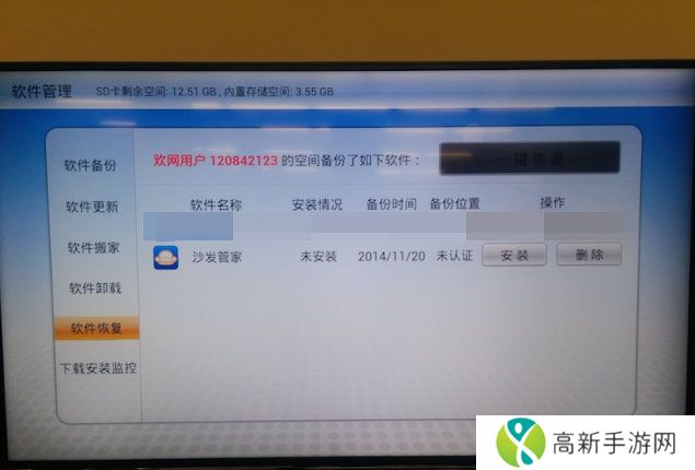 沙发管家安装文件到U盘/SD卡→②U盘连接TCL L43F3390A-3D→③通过“软件恢复”打开安装文件→④安装成功【操作步骤】1. 百度搜索“