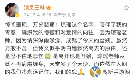 演员王琳发文悼念琼瑶:“惊闻噩耗,万分悲痛!琼瑶这个名字,陪伴了我的青春,编织我的懵懂和对爱情的向往,因为琼瑶老师,因为情深深雨濛濛,成就了今天的雪姨。虽然万般不舍,但我又似乎明白她飘然离去的原由,还是忍不住地悲伤。是离开也是开始,琼瑶老师从此不再病魔缠身,天堂多了个天使,而依然在人间的我们将永远记住,我们的您。”