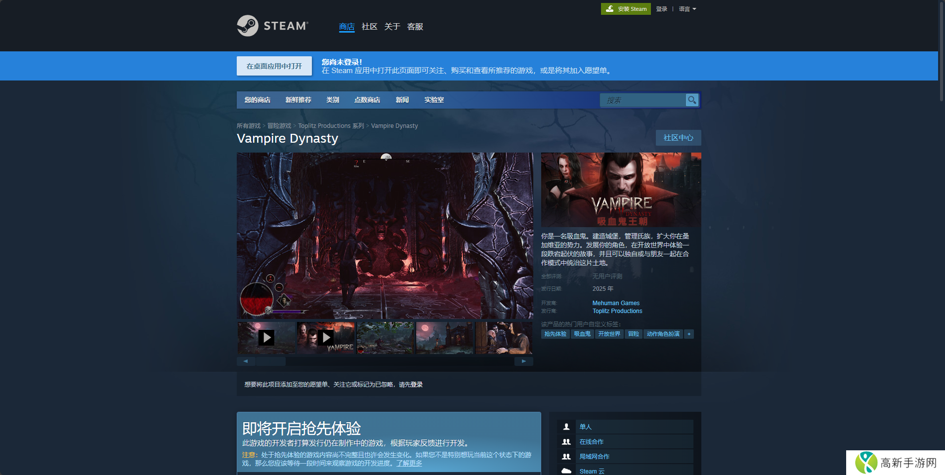 Steam平台需要先安装Steam平台,之后注册一个账号登录,然后搜索“Vampire Dynasty”进入商店购买页面。