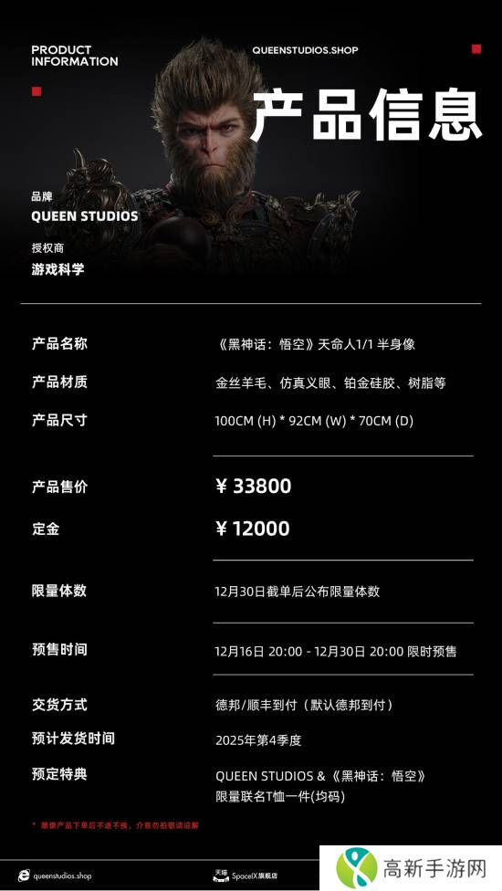由QueenStudios出品,游戏科学官方授权的《黑神话:悟空》主角“天命人”1:1半身立像现已开启预售,售价33800元,定金12000元。预定可获得《黑神话:悟空》限量联名T恤一件。预售时间为