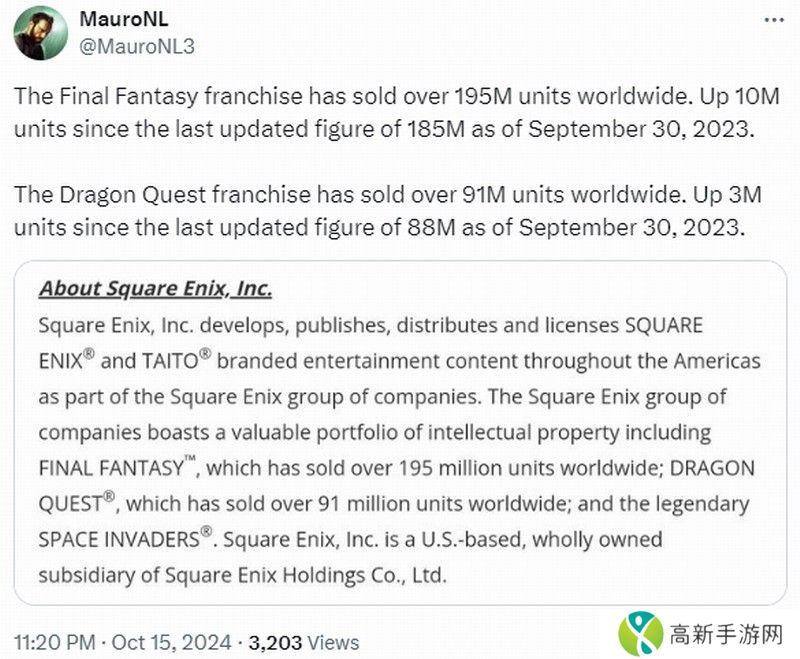 不止是《最终幻想》系列销量在增加,《勇者斗恶龙》系列销量也在不断增加。2023年9月30日SE官方宣布《勇者斗恶龙》系列总销量超8800万份,之后其销量增加了300万份,现在总销量已超9100万份。