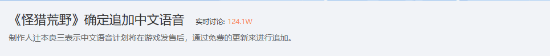 《怪物猎人:荒野》制作人辻本良三日前在接受极乐软件园采访时表示,在游戏发售后,中文语音将会通过免费的更新来进行追加。
