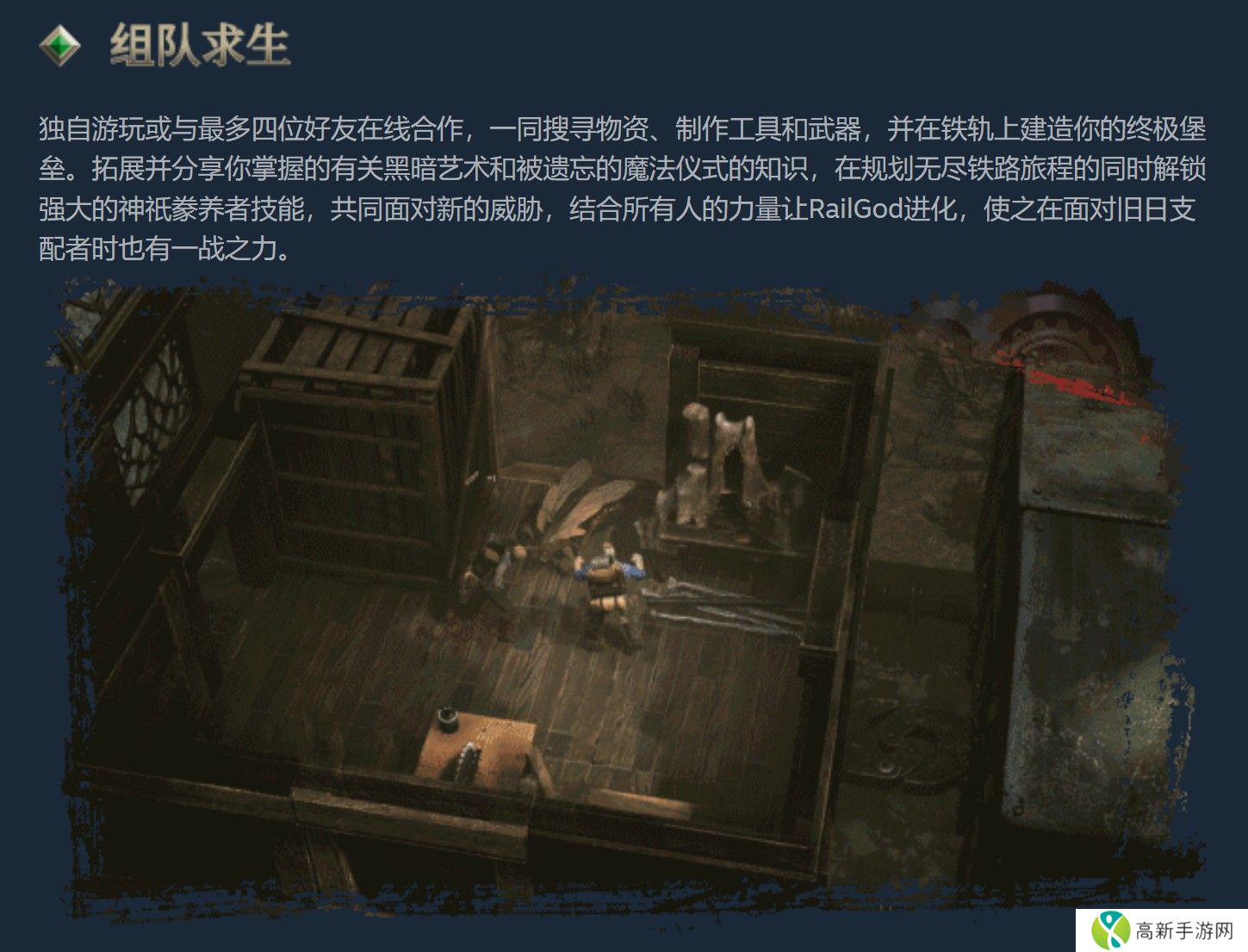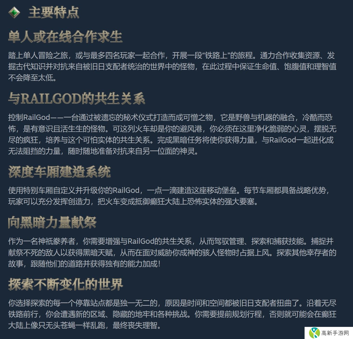 官方表示,游戏可单人游玩,也可与最多四名玩家线上组队游玩,玩家在合作收集资源、揭开古老知识并对抗怪物时,务必随时留意生命值、饥饿值及神智。游戏中的车厢建造系统提供玩家升级与客制化「RailGod」的外观,打造独属于自己的风格。此外,透过探索其余幸存者的故事,玩家将获得独特技能。