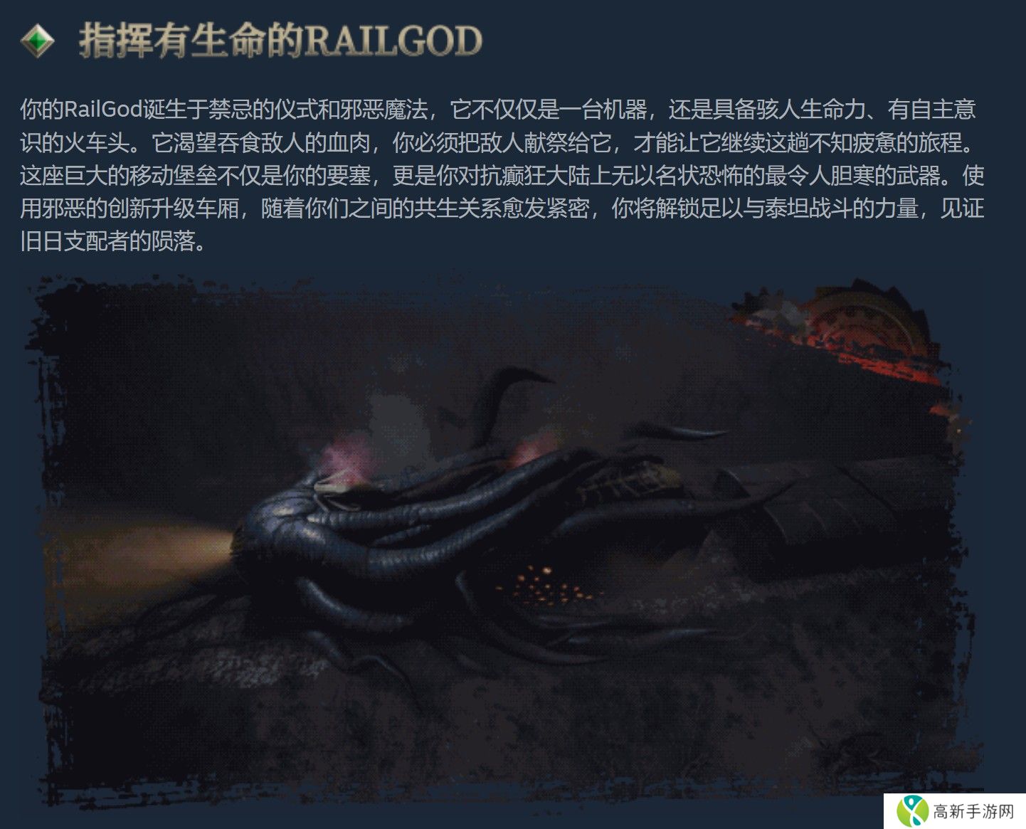 「RailGod」诞生自禁忌仪式与不洁魔法,是个具有感知能力且渴望血肉的火车头,玩家将以此做为据点,透过进行献祭培养与火车的共生连结,获得驾驭管理、探索及禁制的技能,逐步解锁足以与泰坦抗衡的黑暗力量。