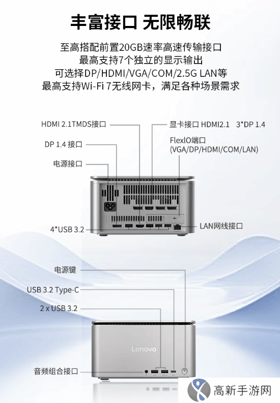 该机正面配备 1 个 3,5mm 音频接口、2 个 USB-A 3.2 接口、1 个 USB-C 3.2 接口;后部配备 2 个 HDMI 2.1 接口、4 个 DP 1.4 接口、4 个 USB-A 3.2 接口。