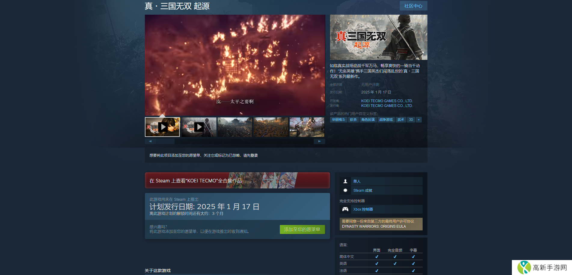 《真三国无双:起源》下载主要看购买版本,Steam版只需要在购买页面购买之后,点击页面中的马上开玩选择文件存放位置就能开始下载了。