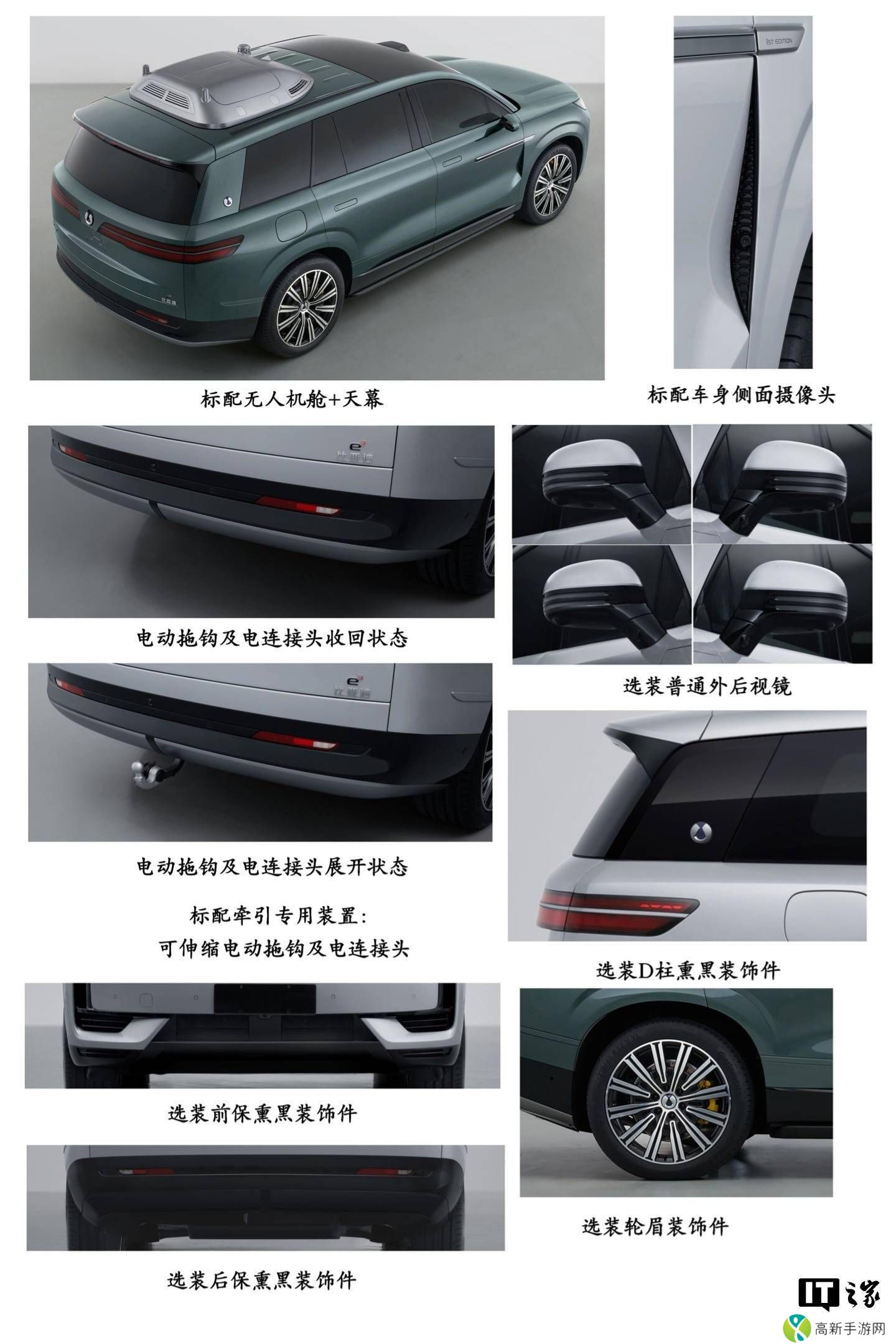 在设计上,腾势N9无人机版SUV不仅标配了无人机舱和天幕,还配备了车身侧面摄像头以及牵引专用装置,包括可伸缩电动脱钩及电连接头,为用户提供了更多便利和实用性。消费者还可以根据个人喜好选择普通外后视镜、D柱熏黑装饰件、前后保险杠熏黑装饰件以及轮眉装饰件等个性化配置。