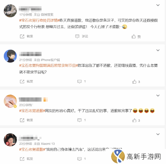 随后,“宝石老舅道歉”迅速登上微博热搜,引发大量网友的讨论和质疑。许多网友对其最初的沉默和后续的道歉方式表达了不满: