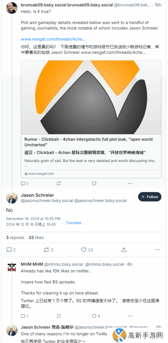 在这之后,有网友特地询问‪Jason Schreier是否收到了相关爆料内容,以此来验证爆料真实性。而Schreier给出了“No”的回答,也就是说他并未像爆料帖所说,收到了泄露内容。