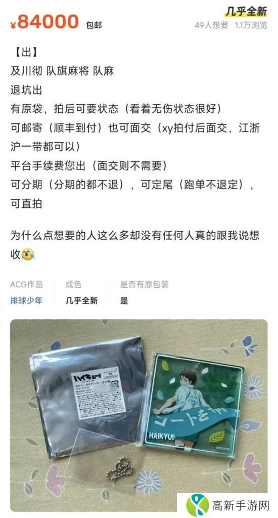吧唧是目前二手市场上最流行的谷子,这些小铁片市面上便宜的几十元,热门的动辄几百上千元。今年,一块《排球少年》里西谷夕角色的吧唧在二手平台上被炒到了7.2万元,传说中这款吧唧全球限量5枚。另一枚同款动漫里及川彻角色的“队旗麻将”被炒到8.4万元人民币,交易平台显示浏览量有1.1万人次。