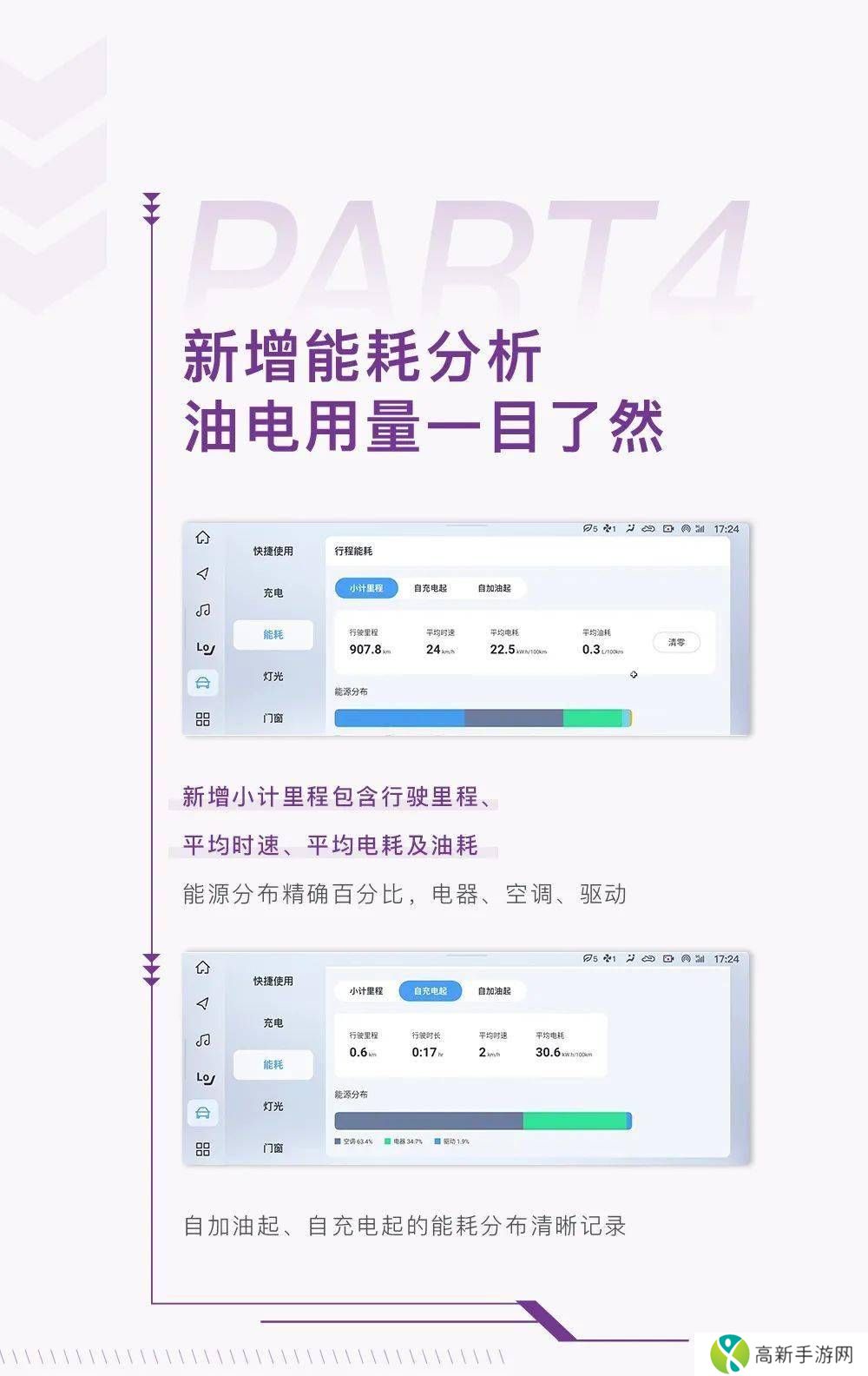 车机设计方面,新版本采用了全新的卡片布局,使得中控屏的0层级交互更加直观易用。副驾娱乐屏的界面也进行了简化,提升了用户的使用体验。在座舱功能方面,新增了能耗分析功能,能够显示行驶里程、平均时速、平均电耗及油耗等详细信息,并支持能源分布显示,包括电器、空调、驱动等具体百分比信息,以及“自加油起”或“自充电起”的能耗记录。
