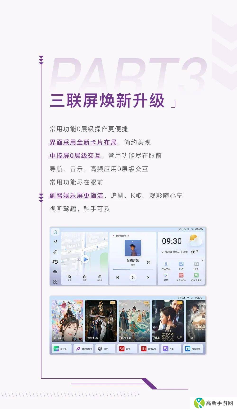 车内配备了三块12.3英寸的液晶屏,并搭载了高通8155车载芯片,支持华为HiCar功能,为用户提供了多种情景模式选择,满足了不同场景下的使用需求。