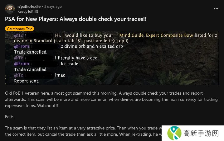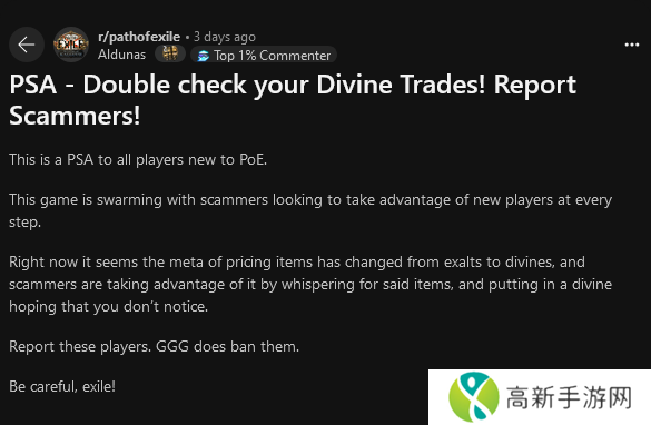 在 Reddit 论坛《流放之路2》分版上,一位老玩家提醒随着新作推出而来的大量新玩家,这些从第一部游戏里就存在的**会骗走玩家辛辛苦苦刷了半天攒下的“积蓄”,或是运气好掉落的装备。帖子写道:“仔细检查你的神圣石(游戏中又来交易和洗点的货币之一)交易,并积极举报**。”