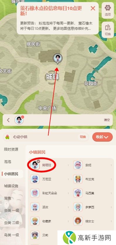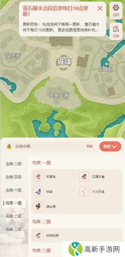 心动小镇地图使用教程:1、地图工具进入之后可以查看每日萤石橡木点位信息,每日十点就会更新,下面还有鸟类,小镇居民,城镇设施等点位地图可以使用。