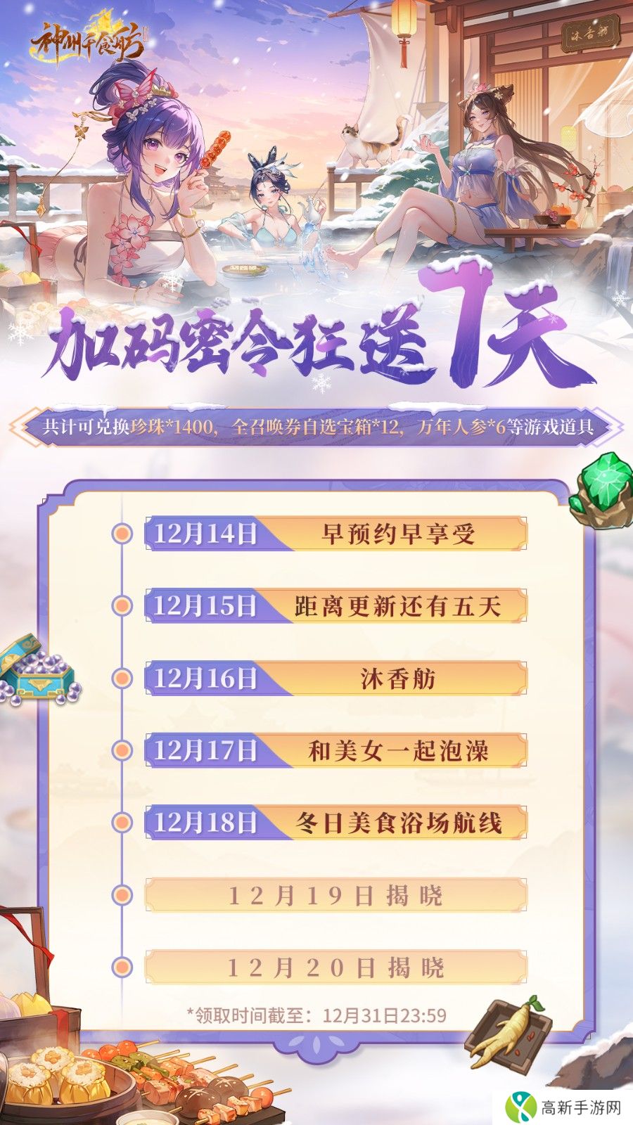 上船泡汤,烦恼跑光!S7赛季&1周年第一波预热将于12月20日正式开启,快来提前感受下“冬日美食浴场”这条新航线的乐趣吧!