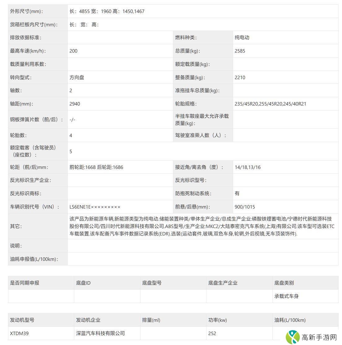 单电机版本的总质量为2585kg,整备质量为2210kg,电机最大功率达到了252kW,最高车速可达200km/h。该版本搭载了由四川时代新能源科技有限公司提供的磷酸铁锂蓄电池,尽管具体续航里程尚未公布,但预计会有不错的表现。