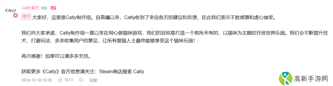 官方表示,能得到玩家的认可他们不胜感激,制作组会积极收集来自各方的建议与反馈,并向玩家承诺,《Catly》会为玩家呈现一个前所未有的、以猫咪为主题的开放世界乐园,让所有爱猫人士都能在这款游戏里找到归属感,享受赛博养猫的乐趣。