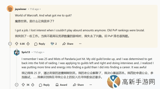 其中,《魔兽世界》是讨论中最热门的游戏之一。许多玩家讲述了他们曾投入的大量时间,而让他们最终放弃的原因往往是“找到了工作”。一位玩家表示:“当我无法再投入大量时间玩游戏时,我就失去了兴趣。”另一位玩家则分享了更戏剧性的经历:“有一天,我的妻子递给我一张表格,上面记录了我一个月玩《魔兽世界》的时长。我每天至少玩四个小时,周末更多。那天之后,我就戒掉了这款游戏。”