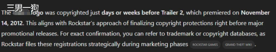 该网友指出,Rockstar Games在每次快要发布第二支预告时,都会在全球范围内对其游戏logo和名称进行版权注册。这一行为在《荒野大镖客:救赎2》(RDR2)和《GTA 5》等游戏发布前均有先例。