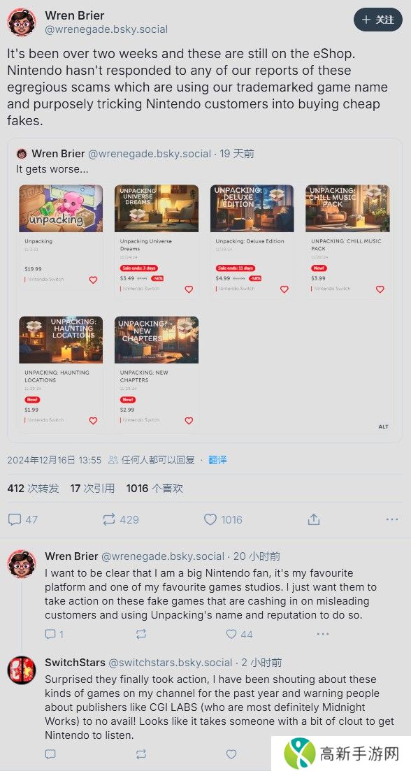 近日,《Unpacking》的创意总监 Wren Brier 在社交媒体上表达了对任天堂未处理“廉价山寨游戏”的不满。