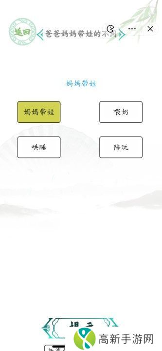 汉字找茬王爸爸妈妈带娃的不同怎么过?这个关卡考验的是爸爸妈妈带娃的方法,主要是需要玩家们进行连线,下面橙子小编就将正确的答案整理到下方,快点来看看吧!爸爸妈妈带娃的不同攻略 1 妈妈带娃:喂奶-陪玩-