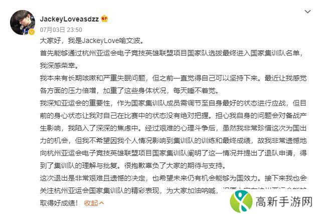 英雄联盟JackeyLove退出亚运会了,这是怎么回事?在今天早上,突然看到这条炸裂的消息,不少小伙伴们还不知道具体的原因,下面小编已经将事情的始末整理到下方了,有兴趣的小伙伴们可以来看看吧!英雄联盟