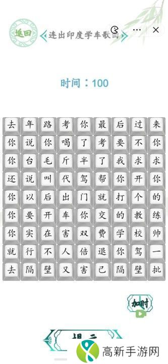 汉字找茬王连出印度学车歌曲需要我们100秒的时间内将歌曲正确的连起来,这次我们将给到大家连歌曲的图,这样大家按图来连歌词就会显得特别轻松,话不多说,我们直接上图文攻略吧!汉字找茬王连出印度学车歌曲图去
