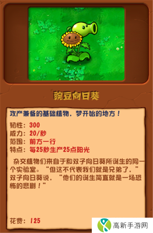本文为玩家带来的是植物大战僵尸杂交版的部分植物作用盘点,此次介绍第1~10关的植物,评分,评价,外形等,让玩家可以更快了解到植物大战僵尸杂交版中的特色杂交植物。一、阳光产出型植物豌豆向日葵评分:★★评