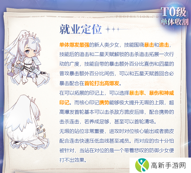 冒险小分队无瑕是单体爆发最强的新人类少女,技能围绕暴击和追击,技能后的追击和二星天赋解锁的击杀追击拓展一次行动的广度,技能自带的暴击额外百分比直伤和四星的普攻暴击额外百分比间伤,可以和五星天赋首回合必