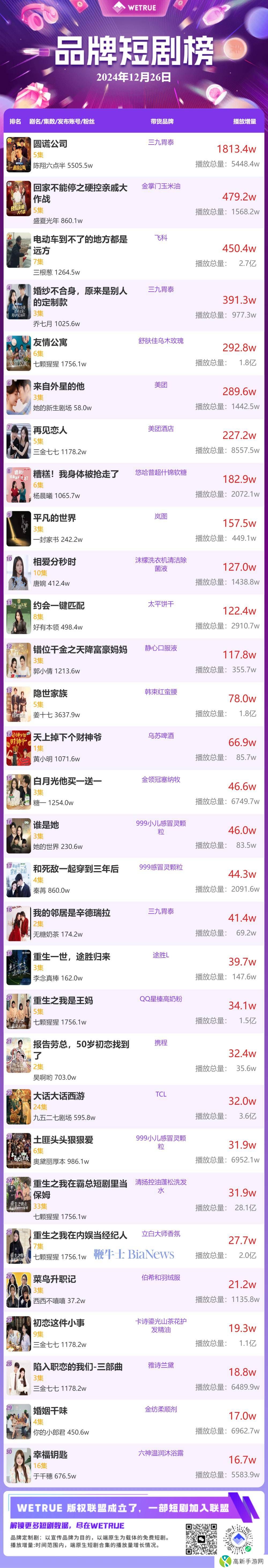 27日品牌短剧热度榜出炉,《圆谎公司》蝉联榜首