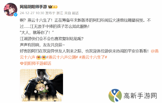 更多【燕云十六声公测】相关报道,点击这里查看>>>网易旗下国产武侠动作游戏《燕云十六声》PC版公测已于今日正式开启,《阴阳师》手游发文进行了庆祝。因《燕云十六声》的“声”与“生”谐音,《阴阳师》手游
