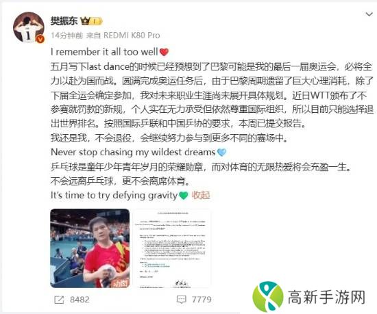 据Vista看天下消息,12月27日,樊振东发文称,“近日WTT颁布了不参赛就罚款的新规,个人实在无力承受但依然尊重国际组织,所以目前只能选择退出世界排名。我还是我,不会退役,