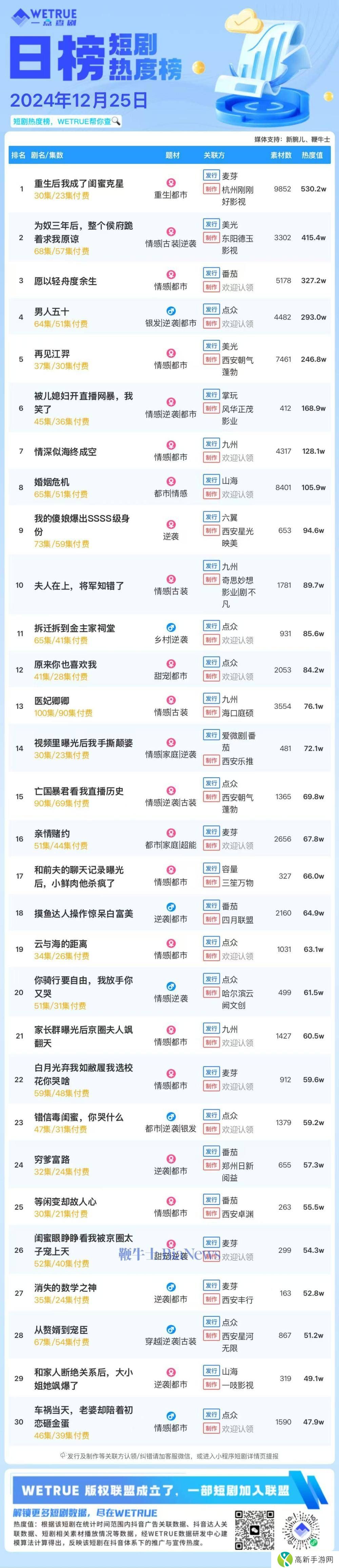短剧热度榜TOP3出炉:《重生后我成了闺蜜克星》领跑,大盘热度破6000万