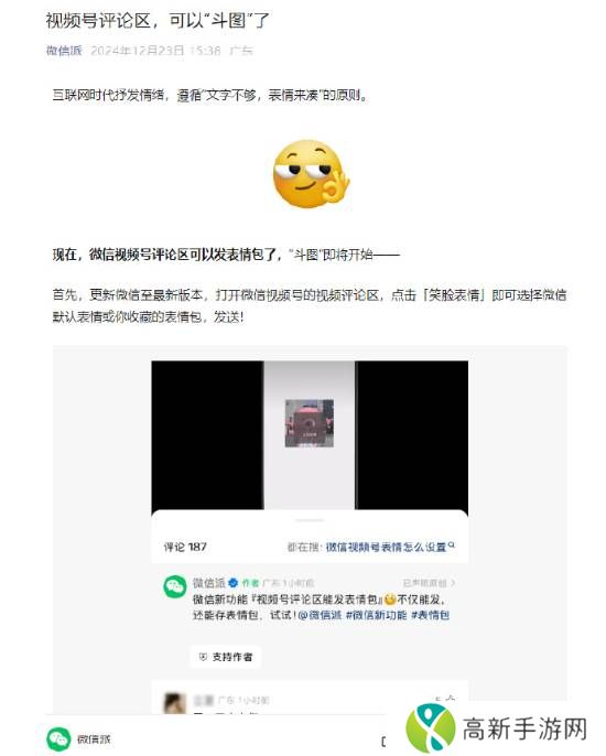 据东方财经报道,12月23日,微信官方宣布新功能上线,微信视频号评论区可以发表情包。据介绍,更新微信至最新版本,打开微信视频号的视频评论区,点击“笑脸表情”即可选择微信默认表